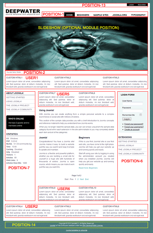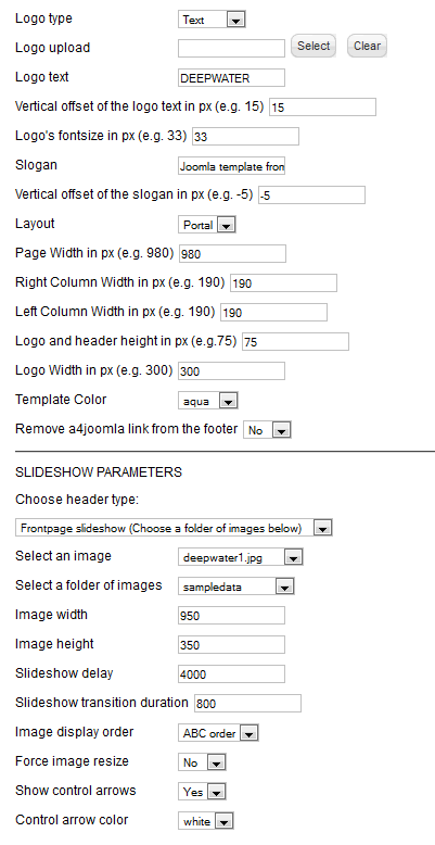 For the slideshow, cut your images to the same size, so that your images' width should be ideally equal to (page width - 30), because if you choose Force image resize: "Yes", then the quality can be worse. You have to use an ftp software like Filezilla, or if you use cpanel on the server, then the file manager to upload the images. You have to upload them into the templates/a4joomla-deepwater/images/sampledata directory. If you want only one image without slideshow, then upload your image into the templates/a4joomla-deepwater/images directory, and choose that image in the parameters.