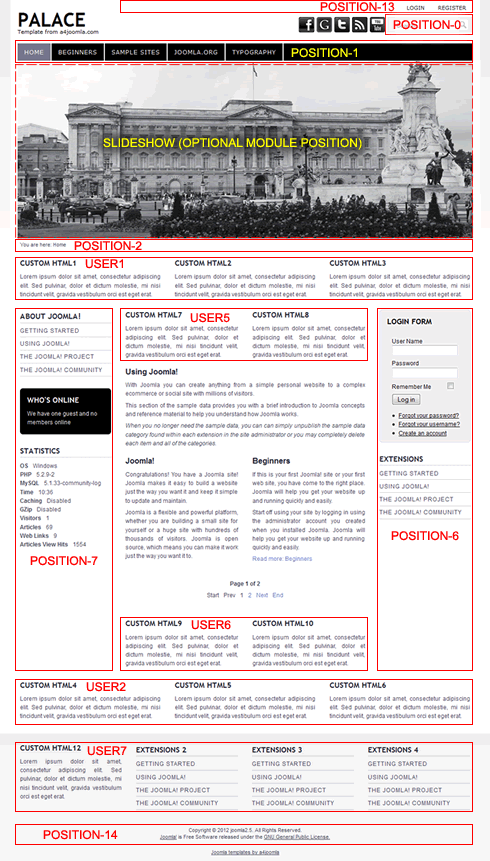 For the slideshow, cut your images to the same size, so that your images' width should be ideally equal to (page width - 30), because if you choose Force image resize: "Yes", then the quality can be worse. You have to use an ftp software like Filezilla, or if you use cpanel on the server, then the file manager to upload the images. You have to upload them into the templates/a4joomla-palace/images/sampledata directory. If you want only one image without slideshow, then upload your image into the templates/a4joomla-palace/images directory, and choose that image in the parameters.