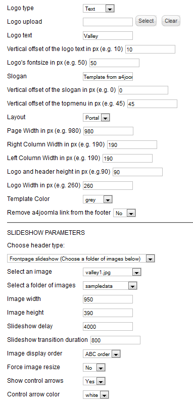 For the slideshow, cut your images to the same size, so that your images' width should be ideally equal to (page width - 30), because if you choose Force image resize: "Yes", then the quality can be worse. You have to use an ftp software like Filezilla, or if you use cpanel on the server, then the file manager to upload the images. You have to upload them into the templates/a4joomla-valley/images/sampledata directory. If you want only one image without slideshow, then upload your image into the templates/a4joomla-valley/images directory, and choose that image in the parameters.