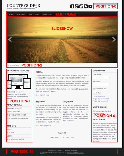 The old built-in slideshow was removed from this template, instead of it a 3rd party slideshow module can be used in the slideshow module position. For demonstration purpose the free and responsive Ari Image Slider was installed for the demo site. You can also place more modules side by side in the slideshow module position, just set the "Bootstrap size" in the module settings (Options/Advanced options/Bootstrap size) so that the sum of the Bootstrap sizes must be 12. On the demo site the slideshow module has a Bootstrap size: 12. Here I show some of the more important Ari Image Slider module settings of mine for the slideshow: