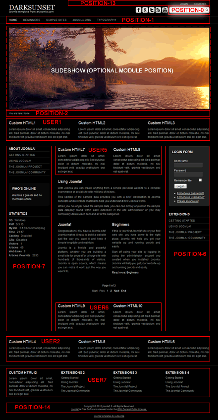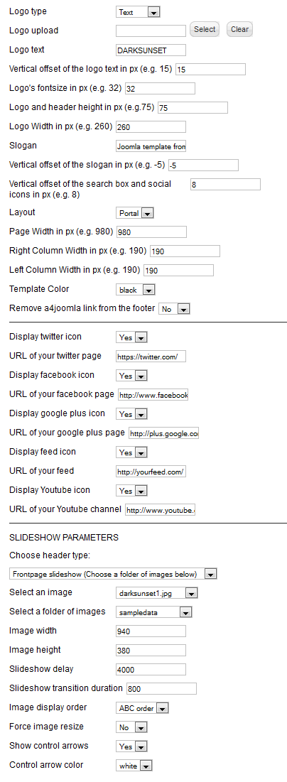 For the slideshow, cut your images to the same size, so that your images' width should be ideally equal to (page width - 40), because if you choose Force image resize: "Yes", then the quality can be worse. You have to use an ftp software like Filezilla, or if you use cpanel on the server, then the file manager to upload the images. You have to upload them into the templates/a4joomla-darksunset/images/sampledata directory. If you want only one image without slideshow, then upload your image into the templates/a4joomla-darksunset/images directory, and choose that image in the parameters.