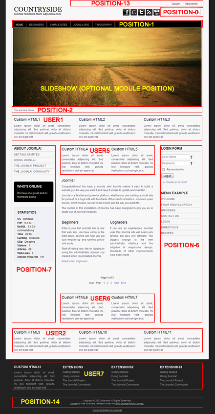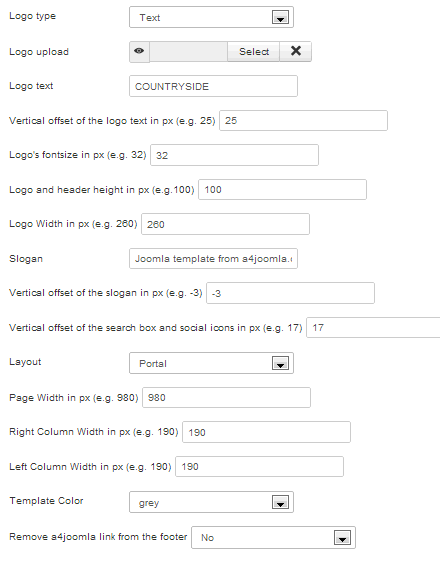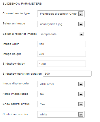 For the slideshow, cut your images to the same size, so that your images' width should be ideally equal to (page width - 70), because if you choose Force image resize: "Yes", then the quality can be worse. You have to use an ftp software like Filezilla, or if you use cpanel on the server, then the file manager to upload the images. You have to upload them into the templates/a4joomla-countryside/images/sampledata directory. If you want only one image without slideshow, then upload your image into the templates/a4joomla-countryside/images directory, and choose that image in the parameters.