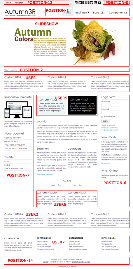 The old built-in slideshow was removed from this template, instead of it a 3rd party slideshow module can be used in the slideshow module position. For demonstration purpose the free and responsive Ari Image Slider was installed for the demo site. You can also place more modules side by side in the slideshow module position, just set the "Bootstrap size" in the module settings (Options/Advanced options/Bootstrap size) so that the sum of the Bootstrap sizes must be 12. On the demo site the slideshow module has a Bootstrap size: 12. Here I show some of the more important Ari Image Slider module settings of mine for the slideshow: