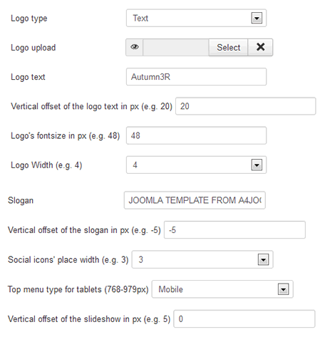 The template uses a 12-column grid, so the Logo width, the Social icons' place width, the Right column width, and the Left column width are the number of columns in the 12 column grid. You may have to play with these settings. Always check how the site looks when you decrease the browser window size, because the template is responsive, and the look of the site changes with the browser (or display) size. For tablet devices you can choose between the mobile topmenu and the horizontal dropdown topmenu. The latter may not be handled well on some tablet devices. But the horizontal menu can also be good for tablets if there are no submenu items.