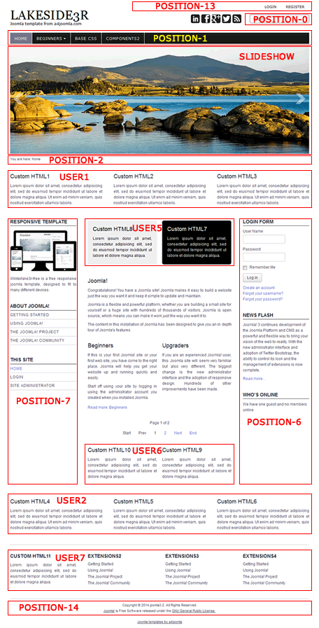 The old built-in slideshow was removed from this template, instead of it a 3rd party slideshow module can be used in the slideshow module position. For demonstration purpose the free and responsive Ari Image Slider was installed for the demo site. You can also place more modules side by side in the slideshow module position, just set the "Bootstrap size" in the module settings (Options/Advanced options/Bootstrap size) so that the sum of the Bootstrap sizes must be 12. On the demo site the slideshow module has a Bootstrap size: 12. Here I show some of the more important Ari Image Slider module settings of mine for the slideshow:
