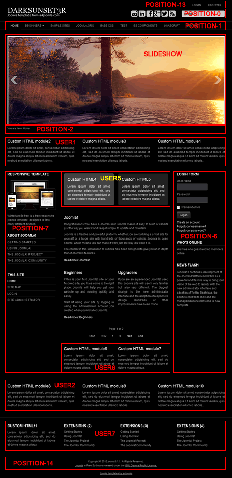 The old built-in slideshow was removed from this template, instead of it a 3rd party slideshow module can be used in the slideshow module position. For demonstration purpose the free and responsive Ari Image Slider was installed for the demo site. You can also place more modules side by side in the slideshow module position, just set the "Bootstrap size" in the module settings (Options/Advanced options/Bootstrap size) so that the sum of the Bootstrap sizes must be 12. On the demo site the slideshow module has a Bootstrap size: 12. Here I show some of the more important Ari Image Slider module settings of mine for the slideshow: